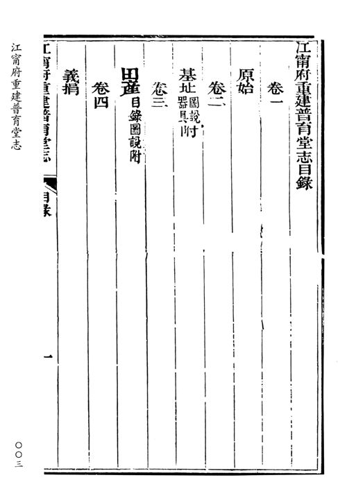 《江甯府重建普育堂志》八卷,清涂宗瀛述。 涂宗瀛(一八一二——一八九四),號朗軒,安徽六安人。以舉人銓江蘇知縣,曾國藩督兩江時檄主軍糧,累保授江甯知府。同治九年(一八七〇)擢蘇松太道,次年遷湖南按察使。 江甯普育堂始建于雍正十一年(一七三三),由時署兩江總督的趙洪恩創辦,堂址位于南城外佟園一帶,分老民、老婦、殘廢、育嬰四堂。太平天國時期,普育堂毀于戰火。同治四年(一八六五),江甯知府涂宗瀛就城內秦淮河南之崇義堂舊址重建普育堂。此後四年間,在兩江總督曾國藩、馬新貽的支持下,普育堂規模不斷擴大。除恢復老民、老婦、殘廢、育嬰四堂外,又增修清節堂以處少嫠之守志者,并設四義學以教孤兒。 江甯普育堂在戰後發揮了重要的社會救濟功能。同治四年底,在堂收養人數即達到一千三百五十九人。作為官營善堂,普育堂在經費來源與管理模式上與同時期大量興起的官督民辦型善堂有所區別。首先,普育堂每年可從善後局獲得撥款,加之各項租息收入,運營經費相對充足,這是民辦善堂所無法比擬的。因此,普育堂的社會救助功能較民辦善堂更為全面。其次,普育堂不以地方士紳董事,總辦、幫辦委員皆由江甯知府從候選、候補官中選任,薪水由堂發放。普育堂職名錄中曾出現過三位委紳,分別是陳開周、謝學元與陳伯銘。其中陳開周與謝學元并未支領過薪水,可見其參與堂務時間較短。陳伯銘于同治四年五月幫辦清查堂產,同治八年轉為清節堂委員,後以委紳身份參與普育堂志纂修。